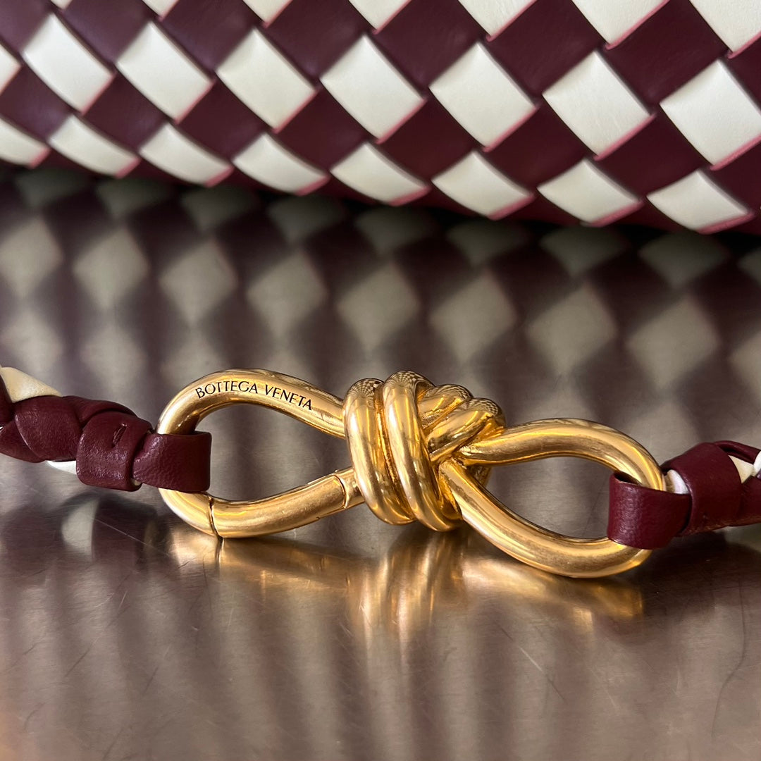 - Small Intrecciato leather top handle bag with sliding cross-body strap - Compartmented interior with one zippered pocket, two open pockets - Magnetic closure - Material: 100% Lambskin - Lining: Lambskin bonded Intreccio - Color: white burgundy