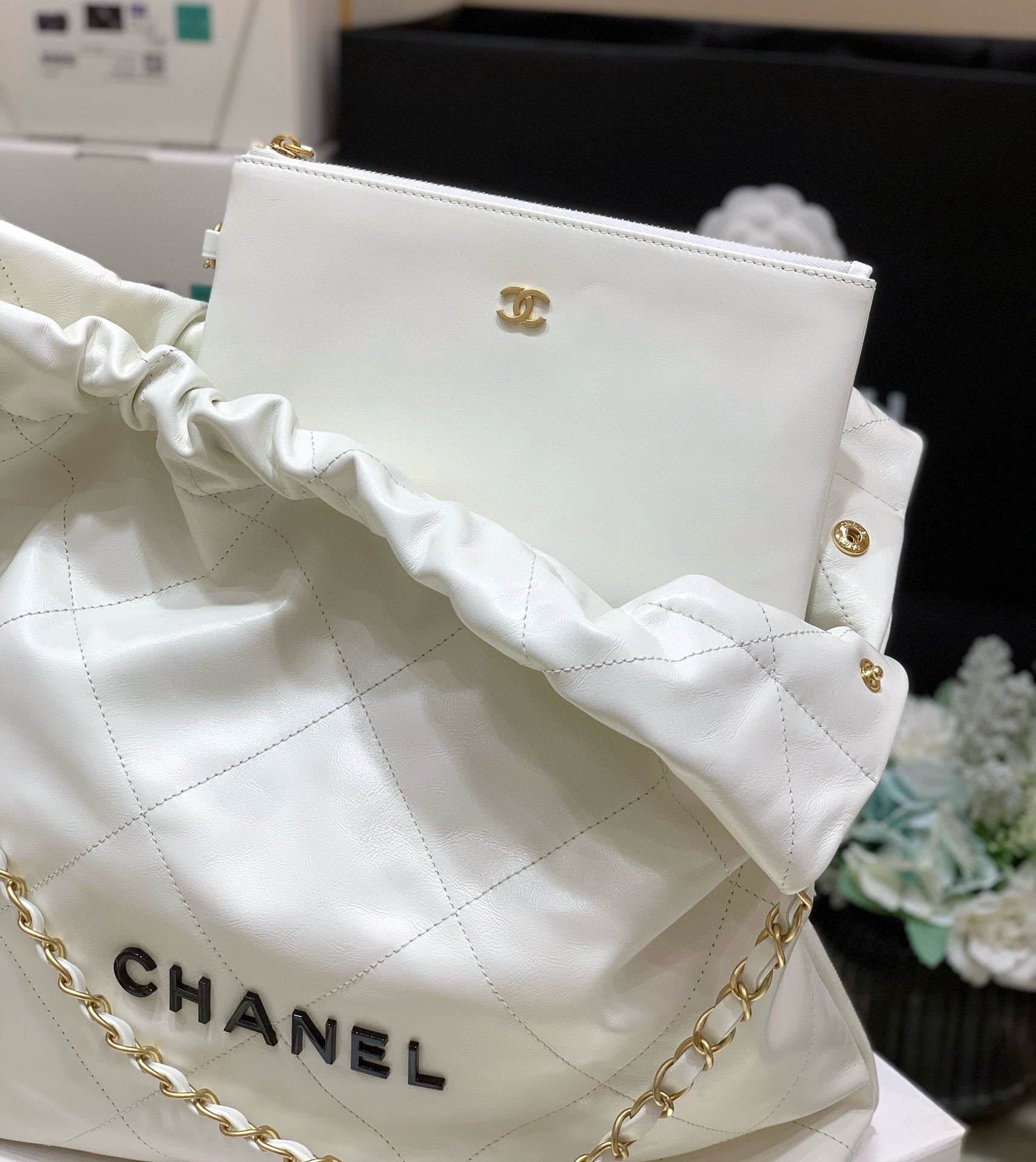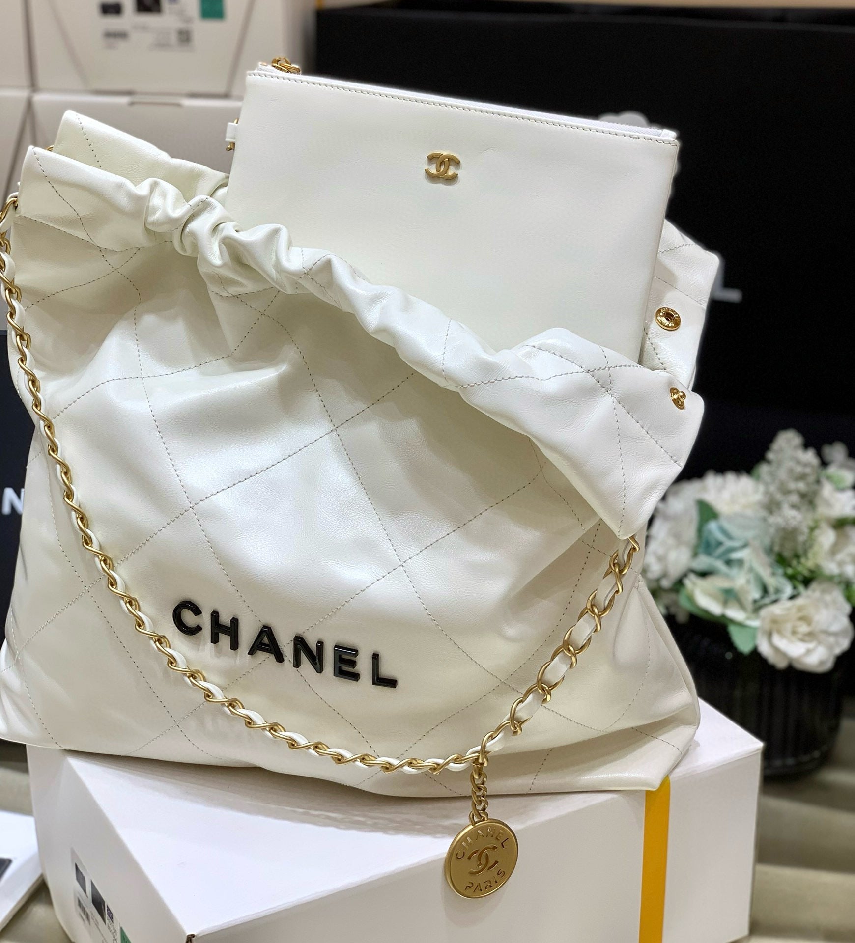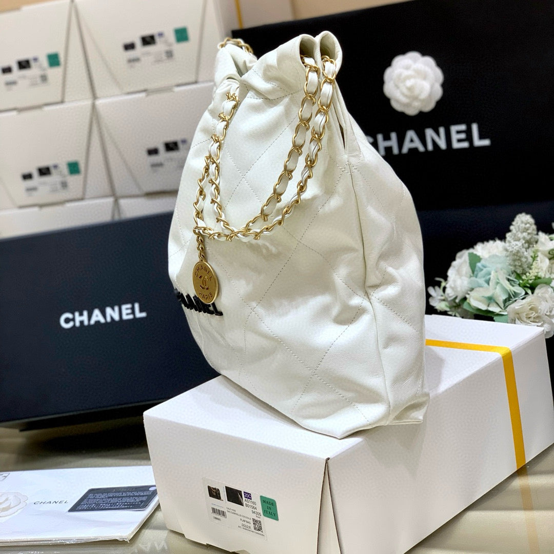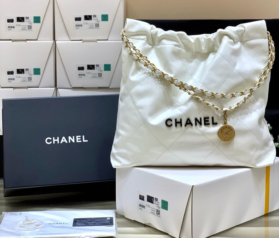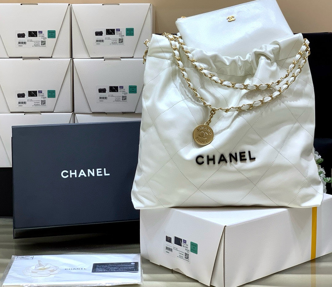 Color: White, Gold hardware, Black logo