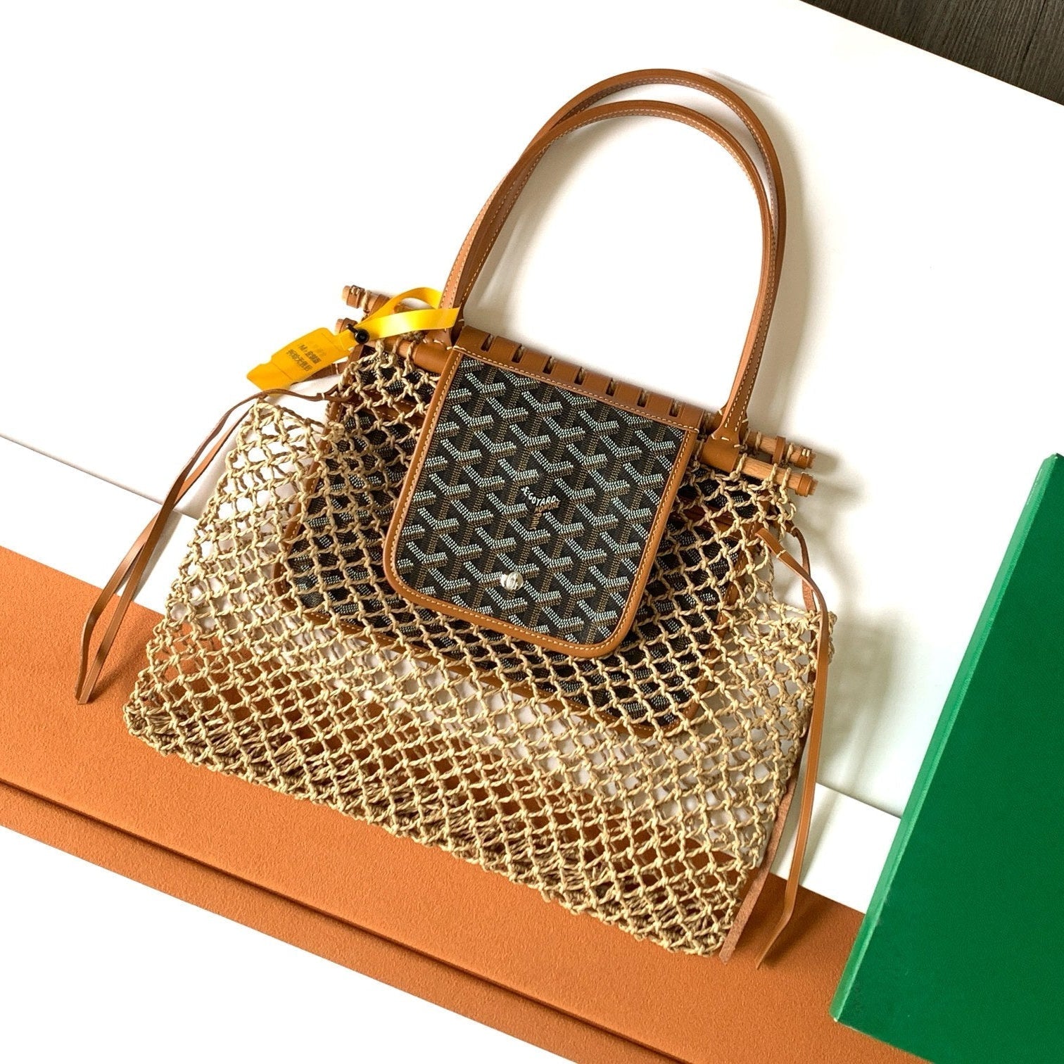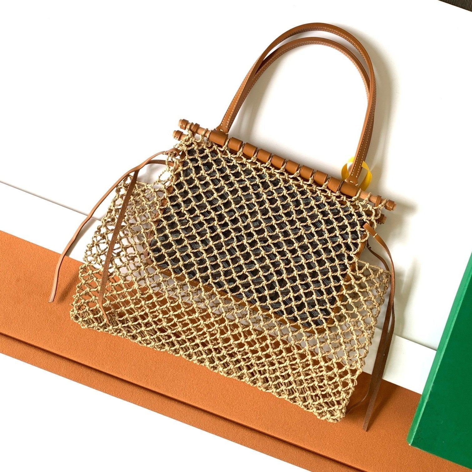 - Material: Woven raffia and calfskin