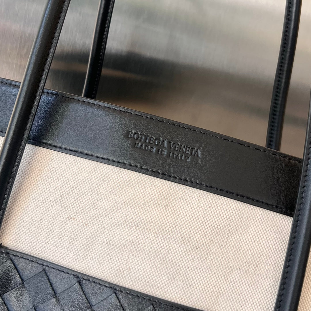 PORTELLO 41 TOTE IN BLACK CALFSKIN AND WHITE CANVAS
